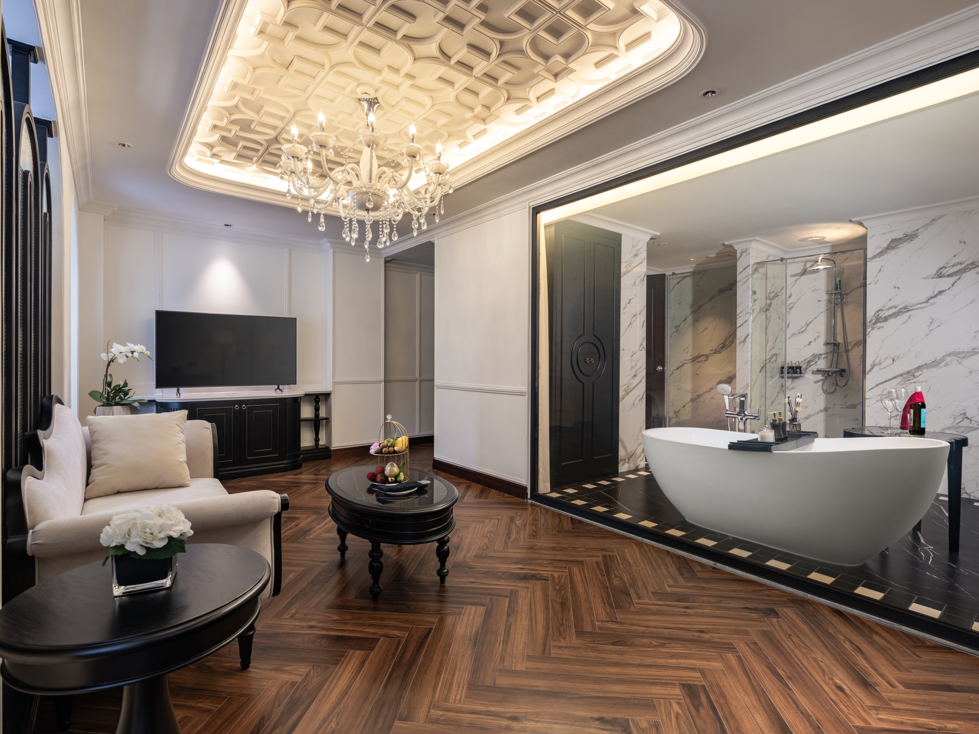 Welcome to our Colonial Executive Internal Window room - a perfect blend of British colonial style and Vietnamese cultural motifs, providing a cozy and luxurious ambiance.